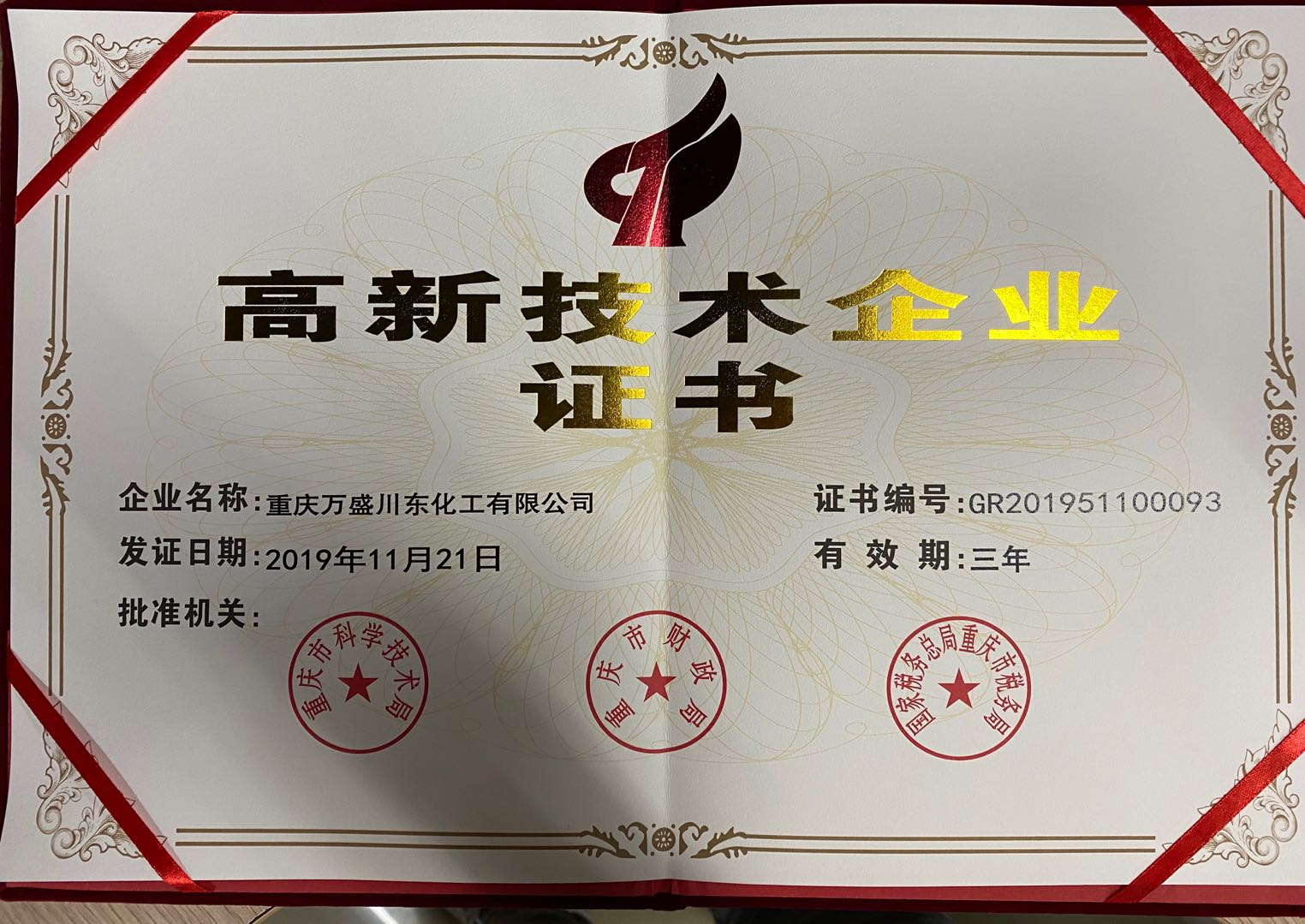 萬(wàn)盛川東化工高新技術(shù)證書(shū)